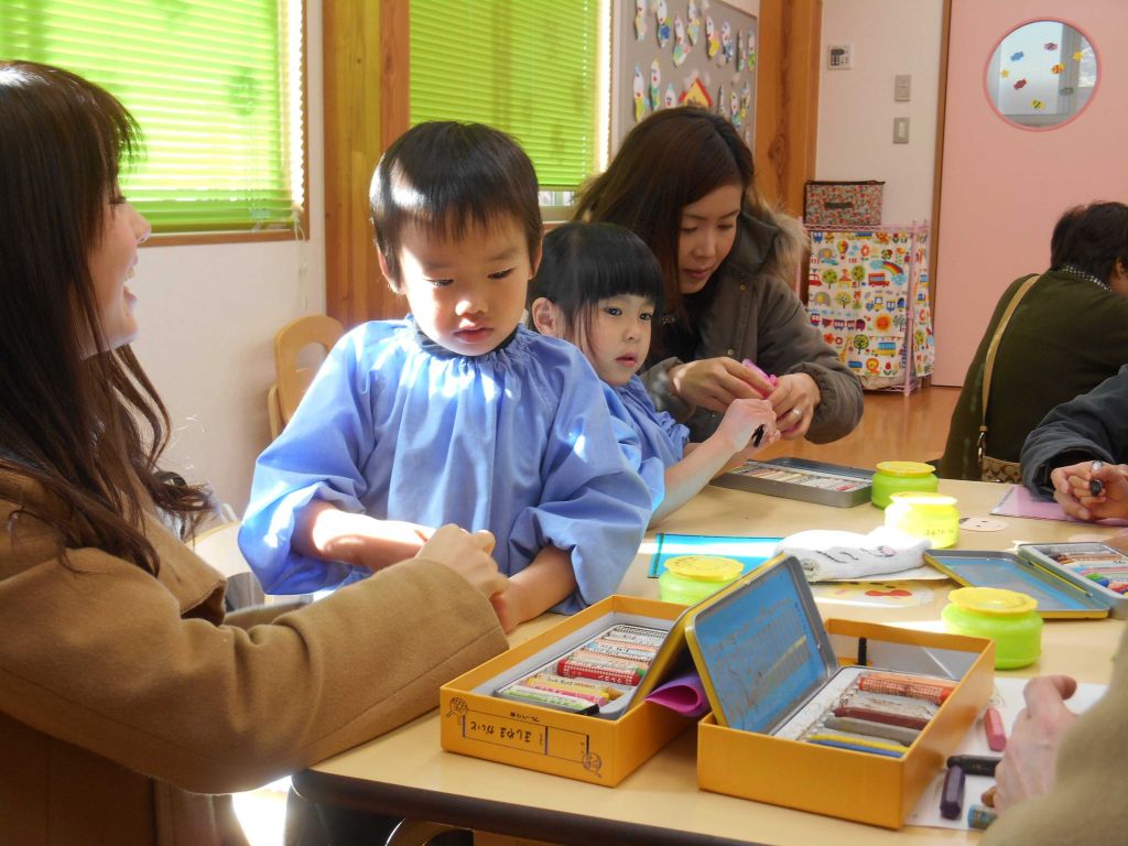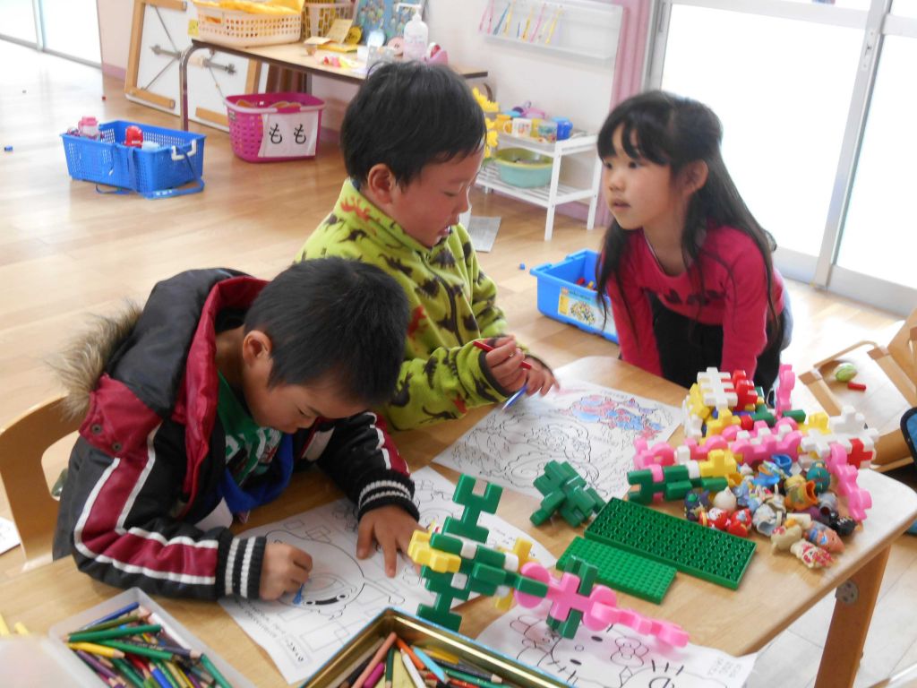 雨の日は みんなで仲良く 折り紙 ぬりえ ブロックで遊びます